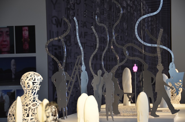 « Thoughts est constituée de phrases, de pensées qui s’entrecroisent et se chevauchent sur de grands bandeaux en acier inoxydable.
